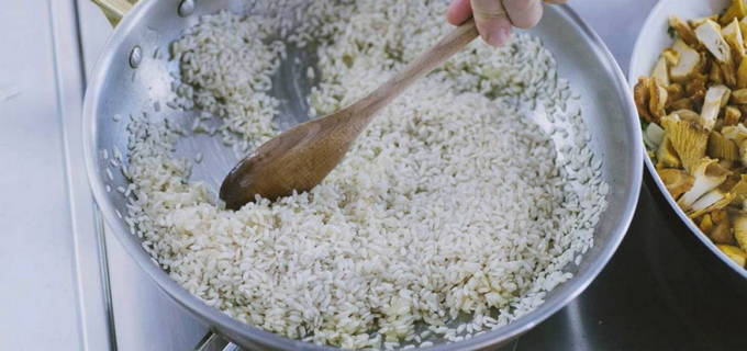 - Rijstarborio of een andere rondkorrel, spoel af en giet bij het uien-paddenstoelenmengsel.