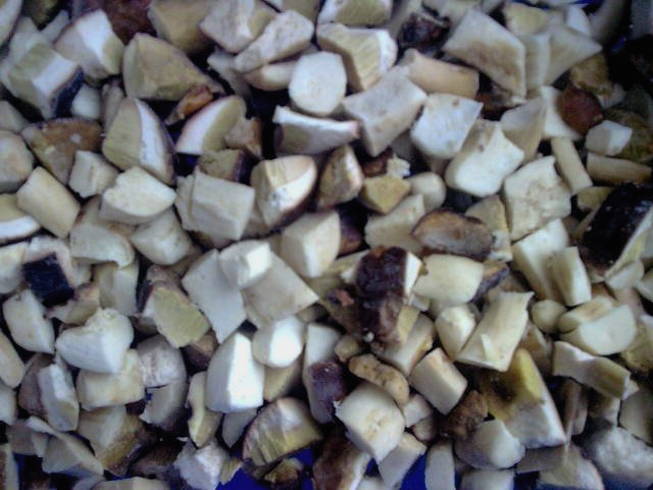 - Week droge champignons een uur in warm water, verse - schil. Snijd de voorbereide champignons in kleine blokjes.