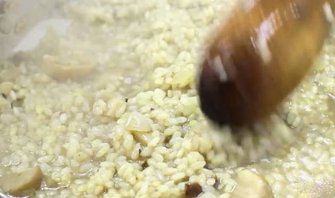 - Giet rijst bij de champignons met uien, meng goed zodat de korrels verzadigd zijn met olie en transparant worden. Giet de wijn in een pan en laat deze volledig verdampen, af en toe roerend met rijst met champignons.
