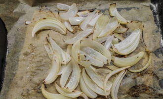 Schil de uien, snij in veertjes en bak 10 minuten in de oven op 220 graden. Snijd het dan in kleine stukjes.