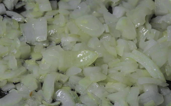 - Schil de uien, snijd ze in blokjes en bak ze transparant in olijfolie.
