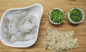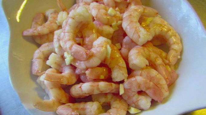 - Hak de knoflook fijn.Giet garnalen met een paar eetlepels olijfolie, voeg knoflook toe, roer en laat 20 minuten marineren.