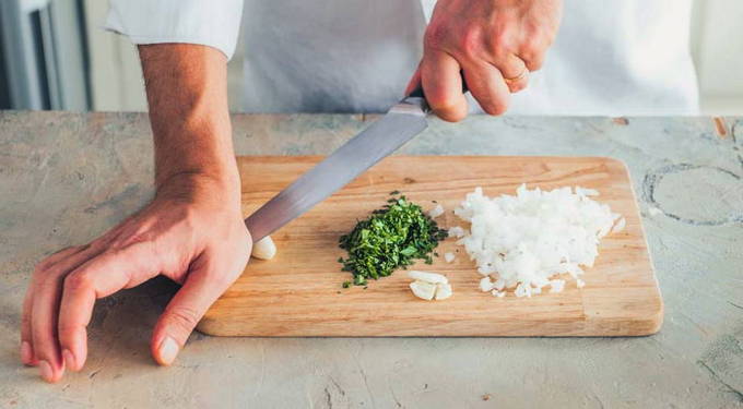 - Snijd de ui in kleine blokjes. Hak de peterselie fijn met een mes. Plet een teentje knoflook met de platte kant van een mes.