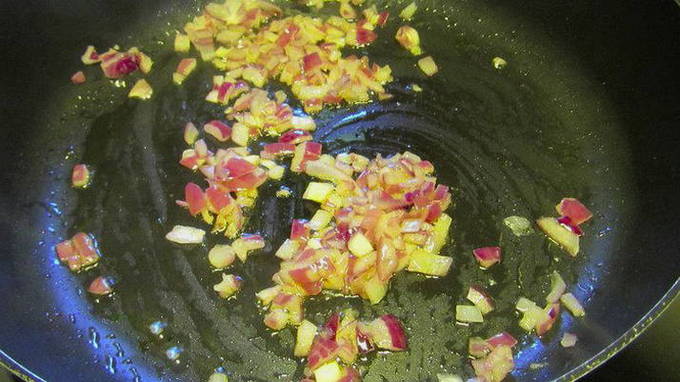 - Snijd de ui in kleine blokjes en fruit ze 5 minuten in olijfolie.