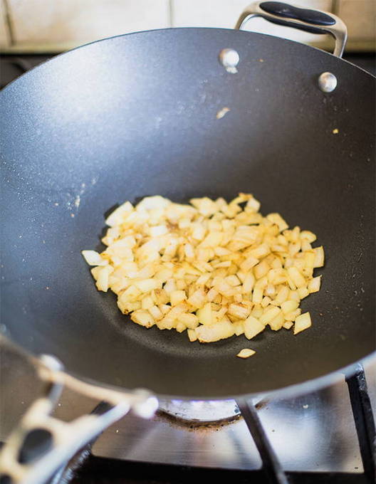 - Smelt de ghee in een koekenpan, fruit de fijngesnipperde ui, zout en breng op smaak.