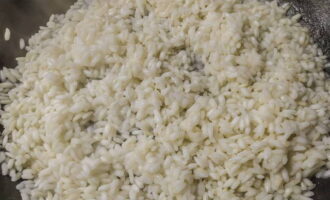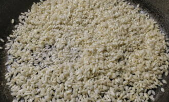 - Voeg dan rijst toe, bak het, onder voortdurend roeren, het zou van kleur moeten veranderen.