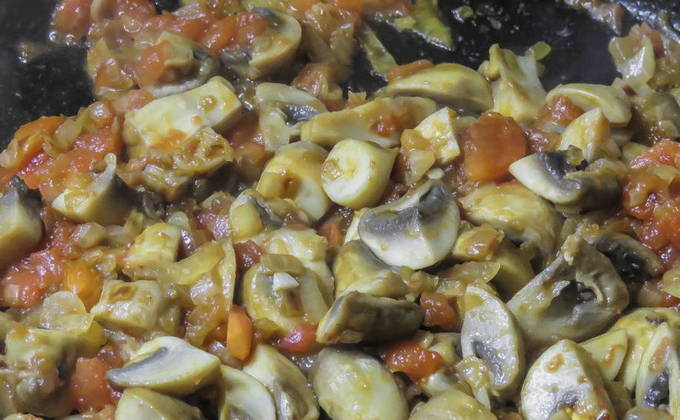 - Was de tomaat, schil hem, snij in blokjes en doe in de pan, laat 5 minuten sudderen.