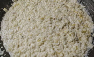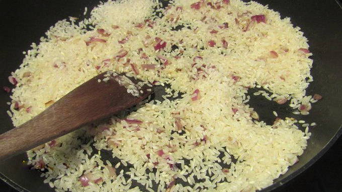 - Voeg vervolgens rijst toe aan de ui, bak een paar minuten. Schenk dan de wijn erbij en bak verder tot deze verdampt is.