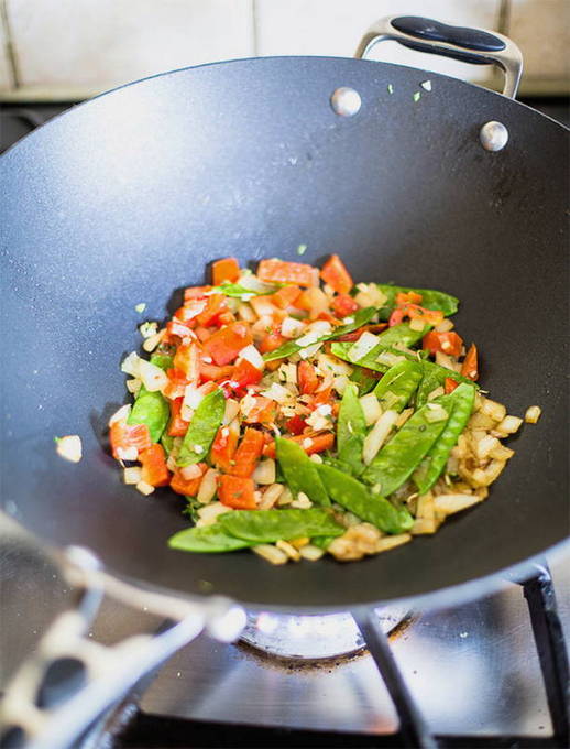- Voeg vervolgens de in blokjes gesneden paprika, doperwten, gehakte knoflook en tijm toe aan de ui. Geef het allemaal samen voor niet meer dan een minuut. Leg de groenten vervolgens op een bord.