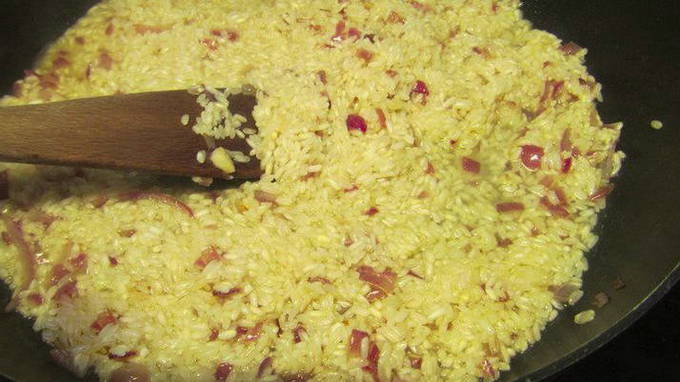 - Doe rijst in een koekenpan, voeg kurkuma, peper, zout, oregano toe, giet wijn en voldoende water erbij zodat de rijst volledig bedekt is. Breng de risotto aan de kook, zet het vuur lager en laat sudderen tot de rijst gaar is.
