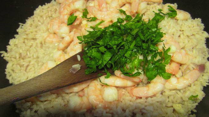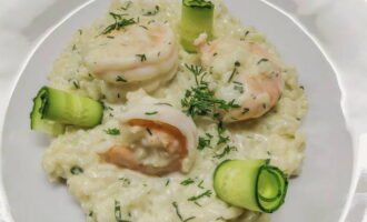 - Voeg op het einde de garnalen toe, kook de risotto nog 3 minuten. Daarna is het gerecht klaar, je kunt het versieren met verse kruiden en serveren.