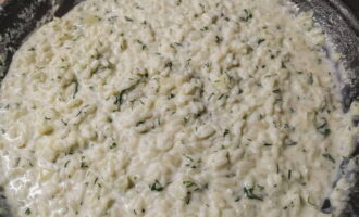 - Voeg vervolgens gehakte greens en garnalen, zout toe en breng op smaak. Kook de risotto nog 5 minuten.