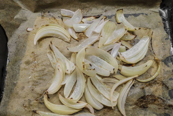Schil de uien, snij in veertjes en bak 10 minuten in de oven op 220 graden. Snijd het dan in kleine stukjes.