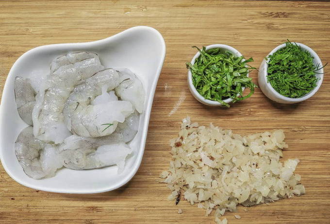 - Hak de knoflook fijn.Giet garnalen met een paar eetlepels olijfolie, voeg knoflook toe, roer en laat 20 minuten marineren.
