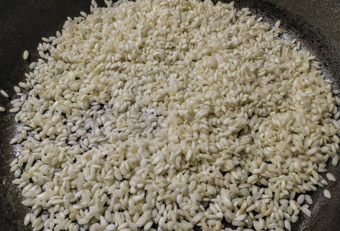 - Voeg vervolgens rijst toe aan de ui, bak een paar minuten. Schenk dan de wijn erbij en bak verder tot deze verdampt is.