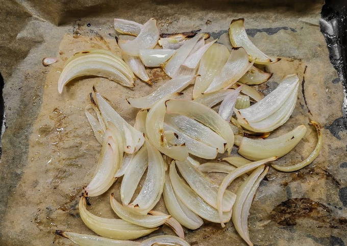Schil de ui, snijd hem in "veren" en stuur hem 10 minuten naar een voorverwarmde oven op 200 graden. Koel en hak de afgewerkte ui.