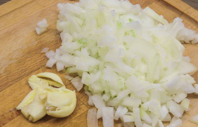 - Pel een ui en hak fijn. We pellen ook een paar teentjes knoflook en drukken die naar beneden met de "rand" van het mes.