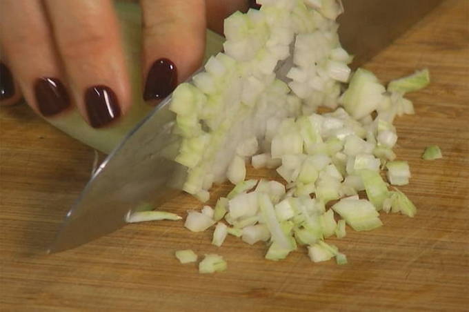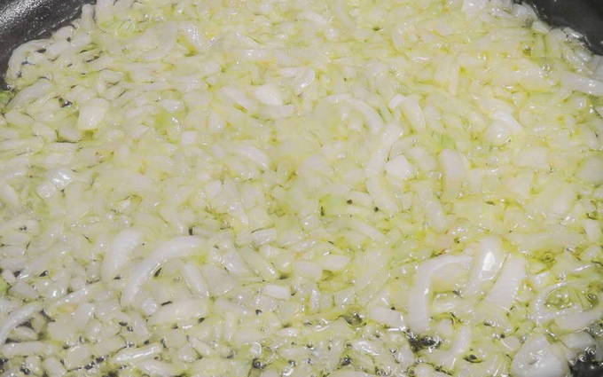 - Maak de ui los van de schil, hak fijn, bak tot transparant in olijfolie.