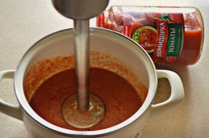 - Giet de tomaten in hun eigen sap in een bak van geschikte grootte, voeg kruiden toe: venkel, basilicum en gemalen zwarte peper - onderbreek tot een gladde massa met een staafmixer.