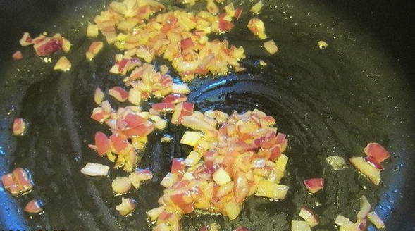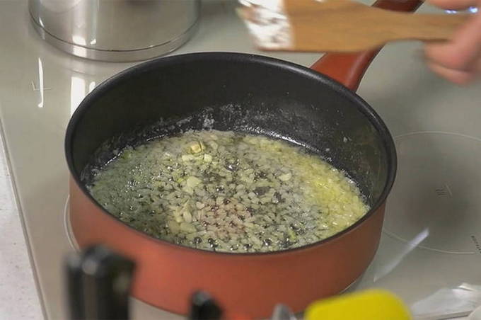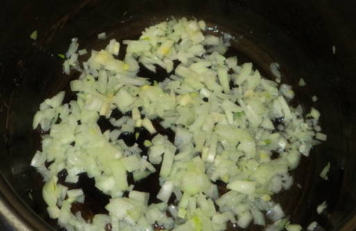 - Verwijder de knoflook en fruit de fijngesnipperde ui in dezelfde olie in 2-4 minuten glazig.
