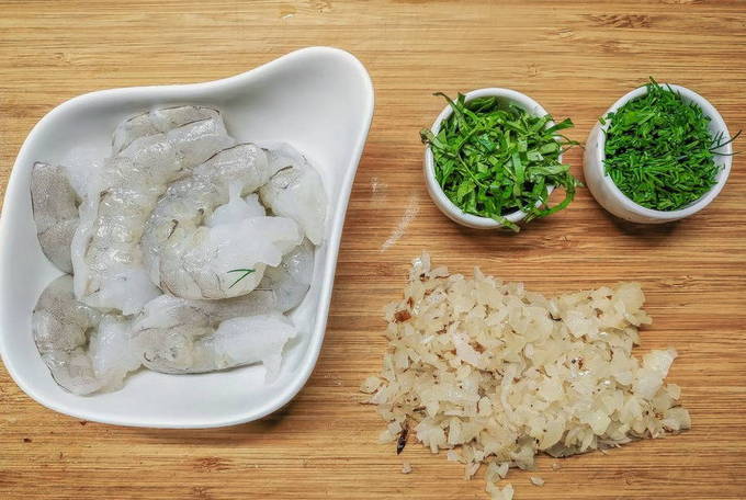 Hak de basilicum en dille fijn, spoel de garnalen en verwijder de darmkrans door de schil lichtjes door te snijden.