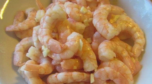 - Haal de garnalen eruit, laat afkoelen en pel ze. Hak een paar teentjes knoflook fijn en stuur het naar zeevruchten, voeg een paar eetlepels olijfolie toe, meng en laat 15-20 minuten marineren.