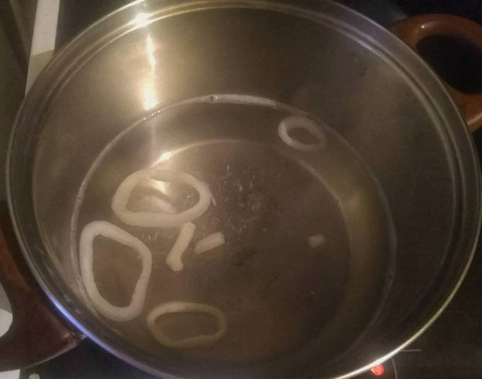 - Snijd de gepelde inktvis in ringen en kook letterlijk 2 minuten in gezouten water. Het is belangrijk om niet te gaar te worden, omdat de schaaldieren dan rubber worden. Na het koken gieten we de bouillon niet uit, het zal nog steeds nuttig voor ons zijn.