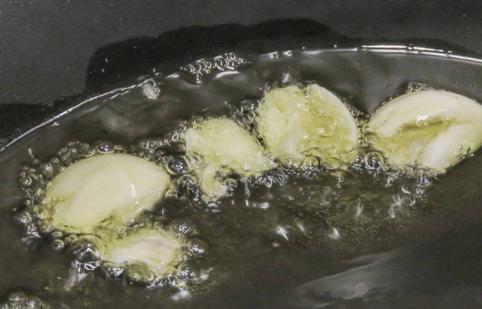 - Verhit een paar eetlepels plantaardige olie in een pan en bak de knoflookteentjes 30-40 seconden.