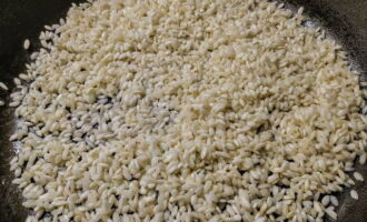 - Voeg vervolgens rijst toe en bak tot de korrels doorschijnend zijn, in de regel duurt het niet langer dan 2 minuten.