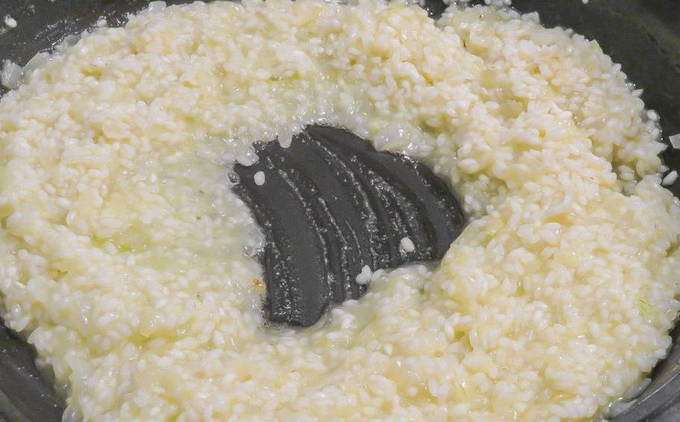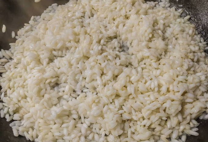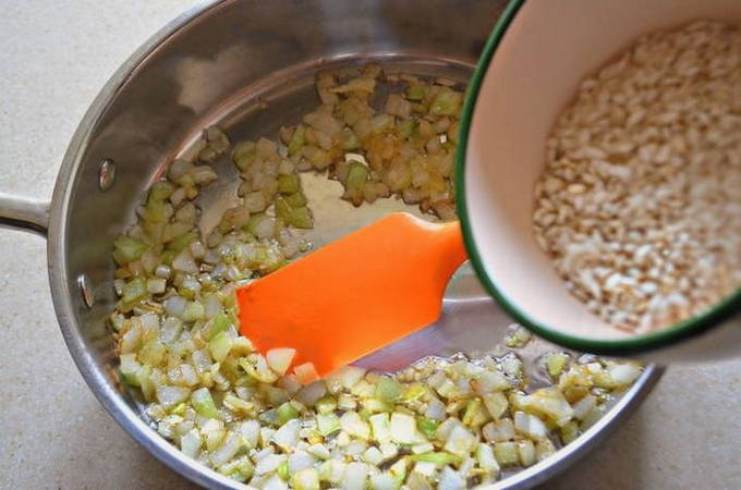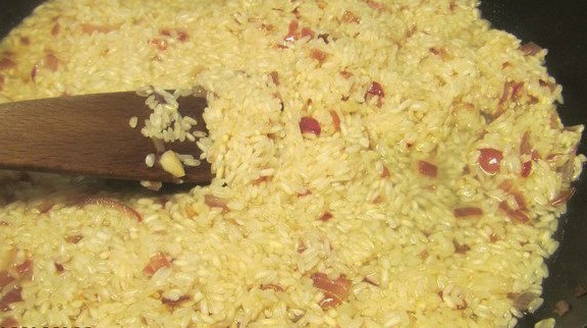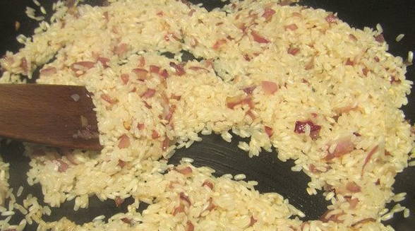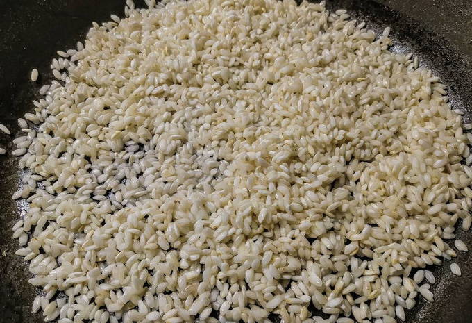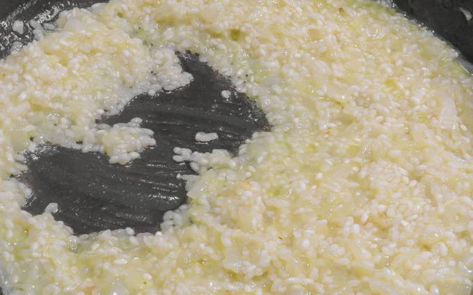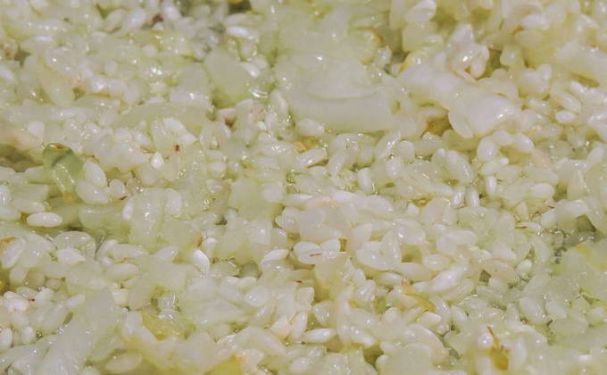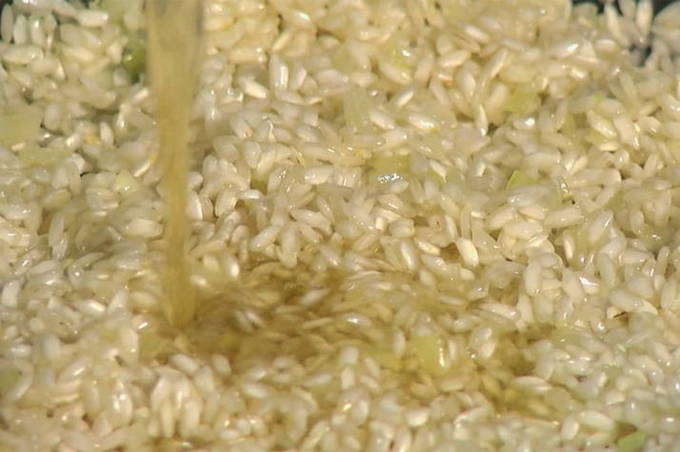 - Giet olijfolie in een pan en fruit de knoflook ongeveer een minuut en verwijder onmiddellijk. Bak in dezelfde olie de ui en voeg de rijst toe, verwarm deze ongeveer 3-4 minuten, giet dan de witte wijn erbij en verdamp de alcohol gedurende 8-10 minuten, onder voortdurend roeren.