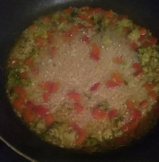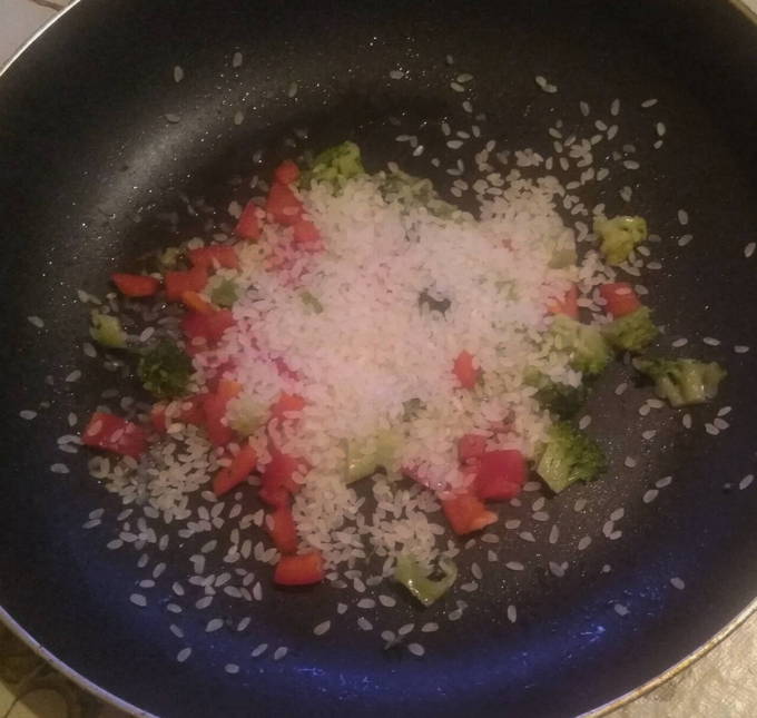 - Voeg rijst toe aan groenten en bak nog een paar minuten.