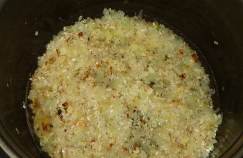 - Voeg voorgewassen rijst toe aan de gebakken uien en bak, onder voortdurend roeren ongeveer 5-6 minuten.