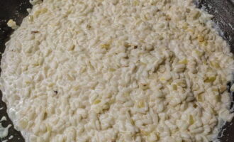 - Voeg 100 milliliter witte wijn (bij voorkeur droge) toe en laat onder voortdurend roeren alle vloeistof verdampen.