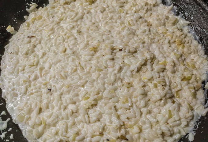 Giet de room bij de halfgekookte rijst en voeg de gesnipperde ui toe - laat het bijna koken tot het gaar is (de buitenkant van de rijst moet helemaal gaar zijn en de binnenkant is een beetje hard).