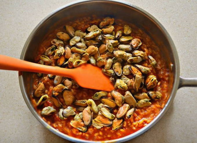 - Als Arborio zacht is aan de buitenkant en stevig in het midden, voeg dan de voorgewassen mosselen toe en kook nog 10 minuten. Zet vervolgens het vuur uit, dek af met een deksel en laat ongeveer 10-15 minuten trekken.