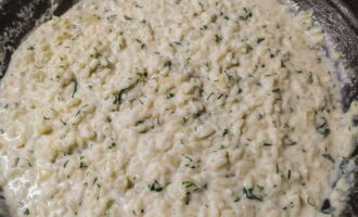 - Haal de pan van het vuur, voeg de geraspte Parmezaanse kaas toe en roer tot een gladde massa.