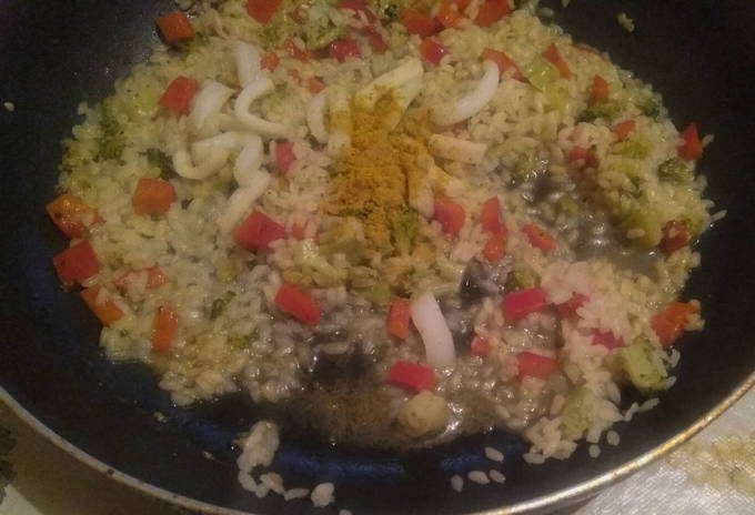 - Rijst is klaar in ongeveer 25-30 minuten - voeg curry en inktvis toe, die desgewenst in kleinere stukjes kunnen worden gesneden.