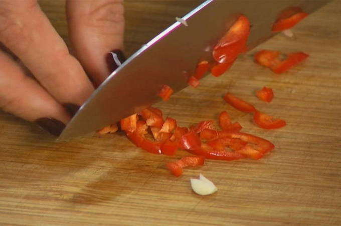 - Snijd de ui in kleine stukjes en druk de knoflook eenvoudig met de "rand" van het mes naar beneden, zodat deze beter zijn aangename aroma afgeeft.