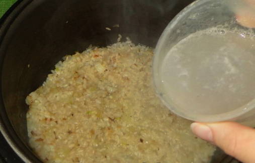 - Vervolgens beginnen we stap voor stap de bouillon van onder de garnaal te introduceren: giet er onmiddellijk 100 milliliter in, zodra al het vocht is verdampt, voeg meer toe. We blijven de bouillon 18-20 minuten toevoegen.