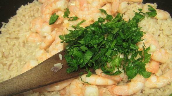 - Voeg als de rijst klaar is Marsala-wijn toe, laat 2-3 minuten sudderen, voeg gehakte peterselie toe en haal van het vuur.