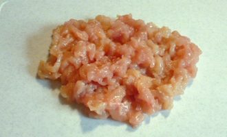 - Om gehakt voor koteletten te maken, hakt u het vlees van de kipfilet fijn (u kunt ook kip uit de poten gebruiken).