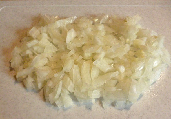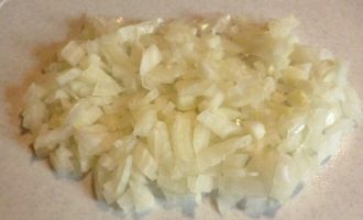 Schil de uien en hak ze fijn met een mes, maar rasp de uien niet, het is belangrijk dat de stukjes bewaard blijven - ze zullen extra sappigheid aan het gerecht toevoegen.