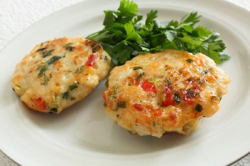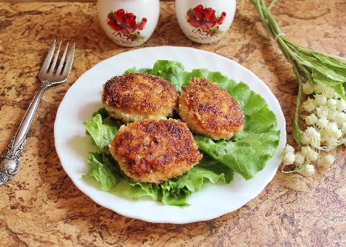 Serveer kant-en-klare sappige gehakte kipfiletkoteletten (filets) met een warm bijgerecht - dit is een zeer smakelijk en voedzaam gerecht!