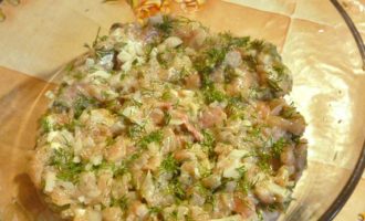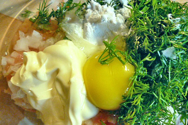 Doe gehakt gehakt, uien en kruiden in een kom, klop de eieren erin, voeg zetmeel en mayonaise toe. Knoflook, fijngehakt en eventueel een lepel boter, zodat de pasteitjes romiger van smaak worden.