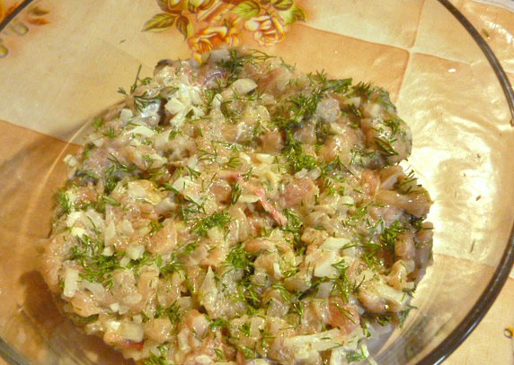 - Voeg ui, gehakte greens, rauw ei, zure room, bloem of zetmeel toe aan gehakt tot gehakte kip.