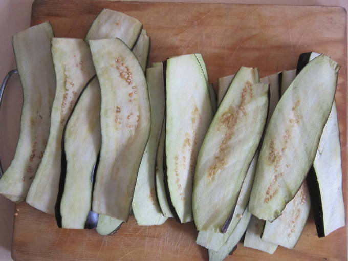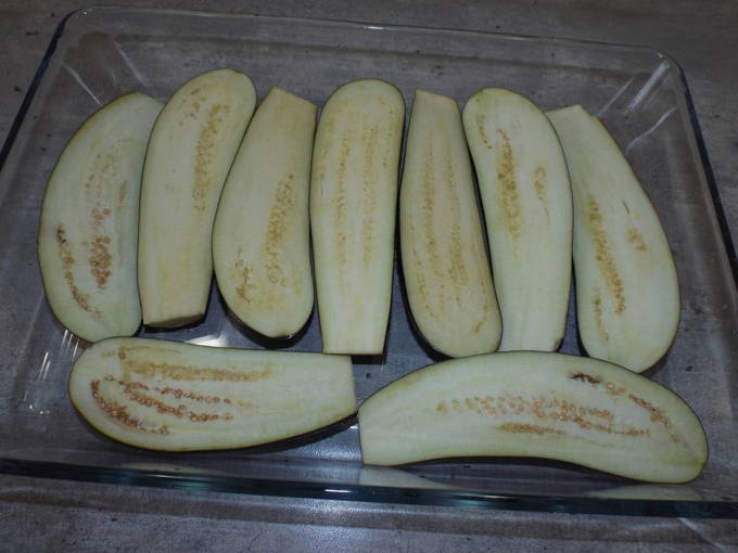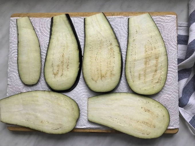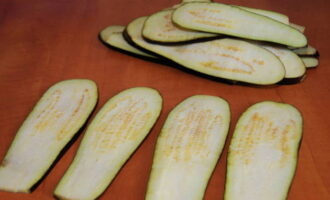 - De staarten van gewassen aubergines worden verwijderd en in de lengte gesneden tot 5 mm dik.