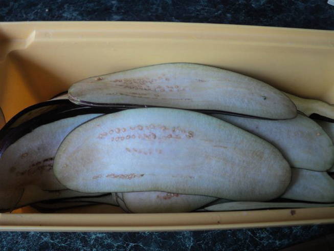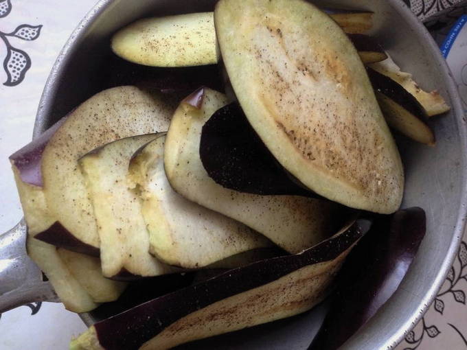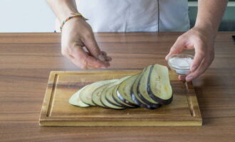 - De gewassen aubergines worden in plakjes van niet meer dan 5 mm dik gesneden en 20 minuten gevouwen, bestrooid met zout, in een bak.