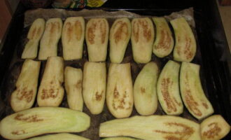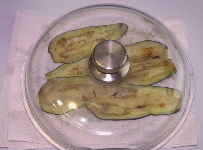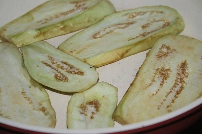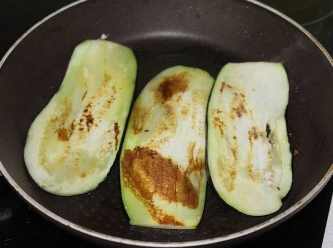 - Aubergineplakken worden gewassen, uit overtollig vocht geperst en in olie gebakken totdat ze een aangename gouden tint krijgen. Overtollig vet wordt verwijderd met keukenpapier of handdoeken.