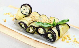 - Verspreid voor elke voorbereide plak aubergine een beetje vulling, rol het op en plaats het in de koelkast om af te koelen. Eet smakelijk!