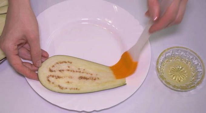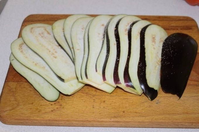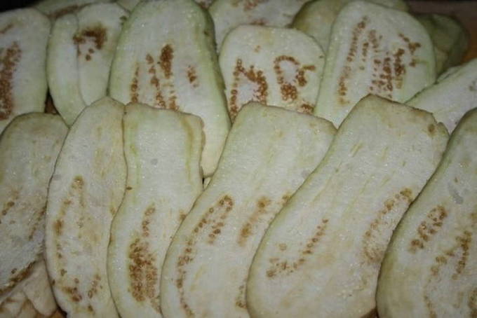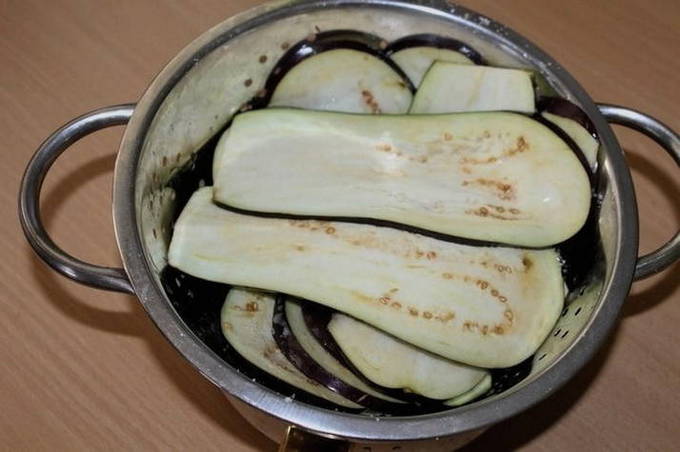 - De aubergines worden gewassen, in plakjes gesneden, waarvan de dikte niet meer dan 3 mm mag zijn, en vervolgens 10 minuten met heet zout water gegoten.